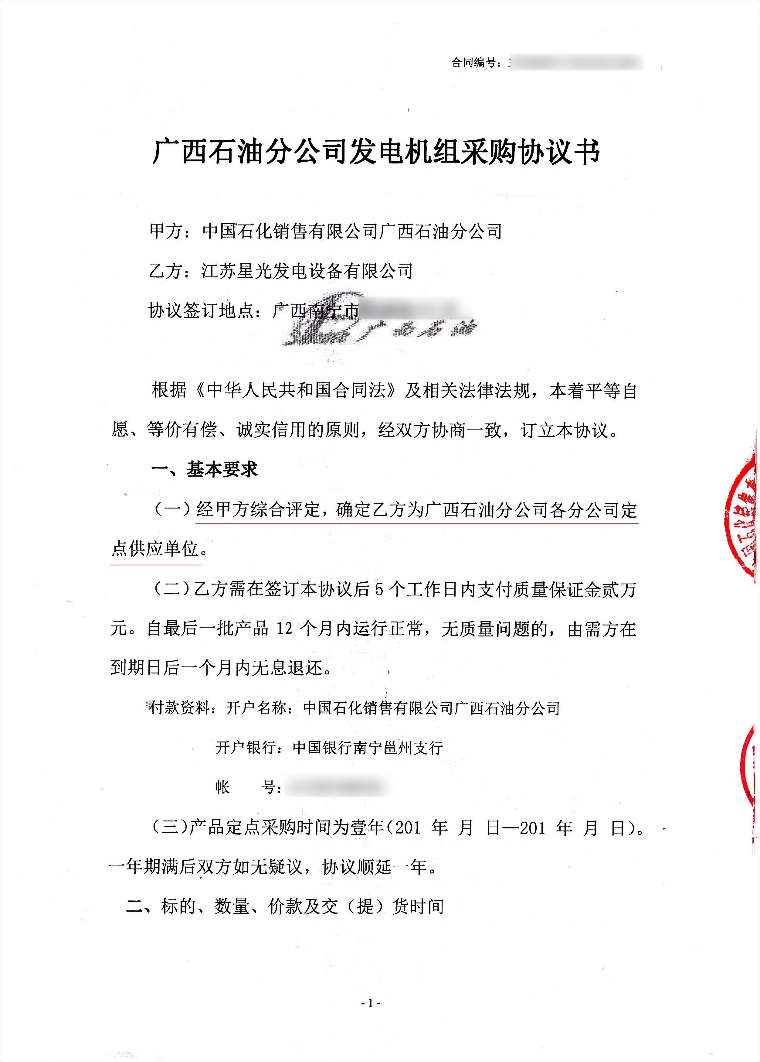 江蘇星光動(dòng)力集團(tuán) >> 新聞動(dòng)態(tài) >> 熱烈祝賀我公司成為廣西石油分公司各分公司發(fā)電機(jī)組采購(gòu)定點(diǎn)供應(yīng)單位