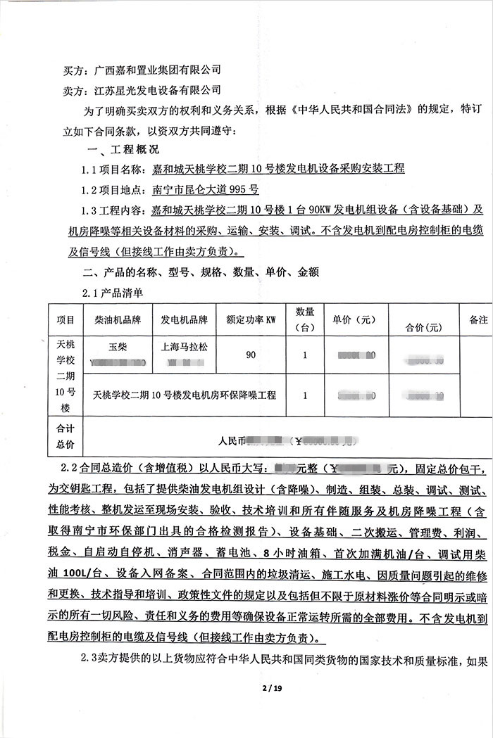 7月25日,我公司成功簽訂嘉和城天桃學校二期10號樓發(fā)電機設備采購安裝工程項目。此次采購的發(fā)電機組品牌為玉柴發(fā)電機組,功率為90KW,配置為玉柴發(fā)動機配上海馬拉松發(fā)電機。本次購機服務包括機房降噪等相關設備材料的采購、運輸、安裝、調試等。