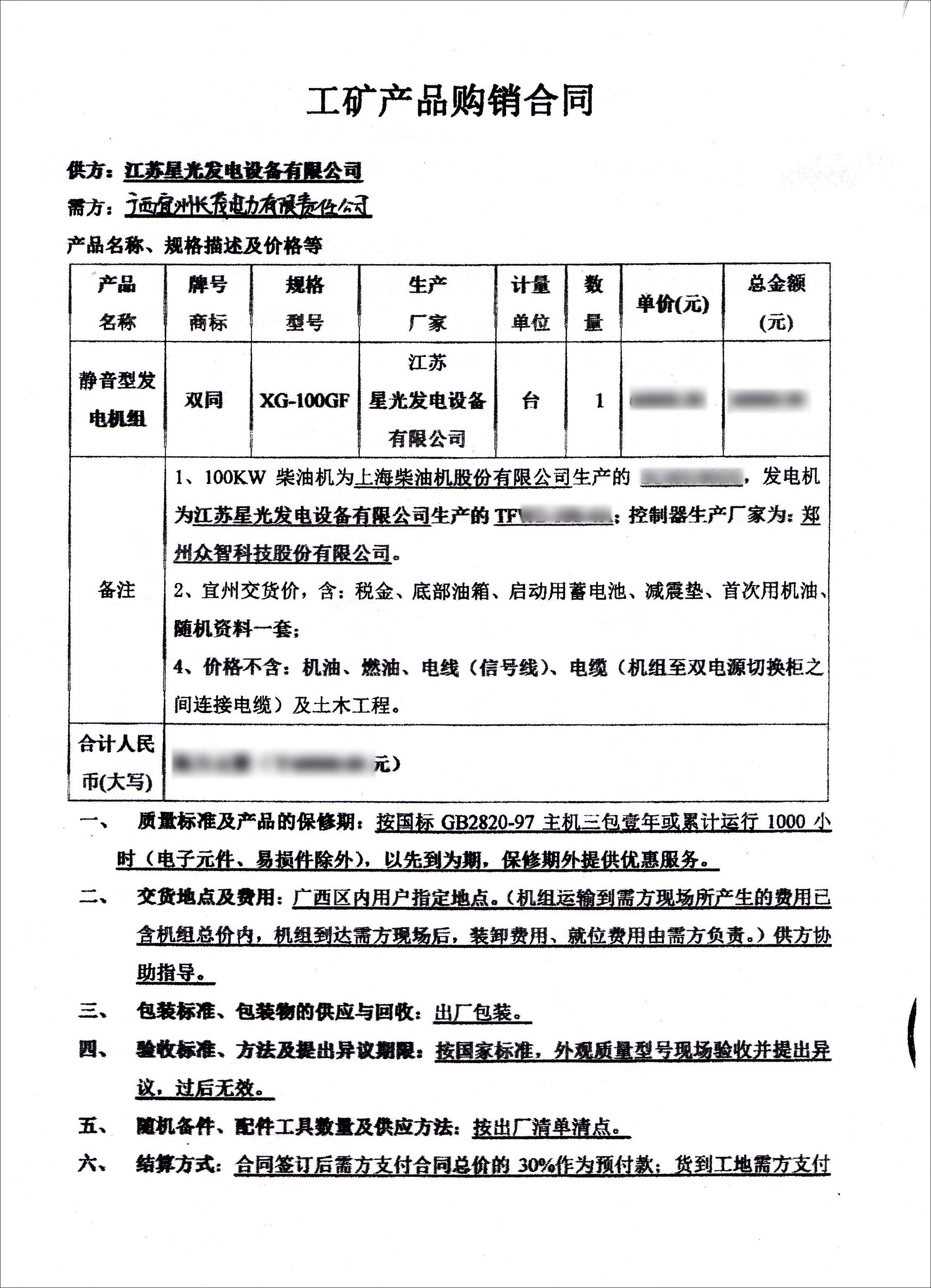610日,廣西宜州長(zhǎng)茂電力公司(主要經(jīng)營(yíng)電力投資開(kāi)發(fā)、電力檢修、建筑材料銷(xiāo)售等)在我公司采購(gòu)一臺(tái)配置為上柴發(fā)動(dòng)機(jī)配星光發(fā)電機(jī)的100KW靜音型上柴發(fā)電機(jī)組。我公司將按合同規(guī)定為其提供優(yōu)質(zhì)的產(chǎn)品和服務(wù),絕不以次充好,建立用戶檔案,可定期或隨時(shí)上門(mén)為機(jī)組進(jìn)行檢查、保養(yǎng)及維修,以及時(shí)消除機(jī)組隱患,保證機(jī)組處于最佳運(yùn)行狀態(tài)。更多發(fā)電機(jī)詳情歡迎撥打星光熱線:13878198542