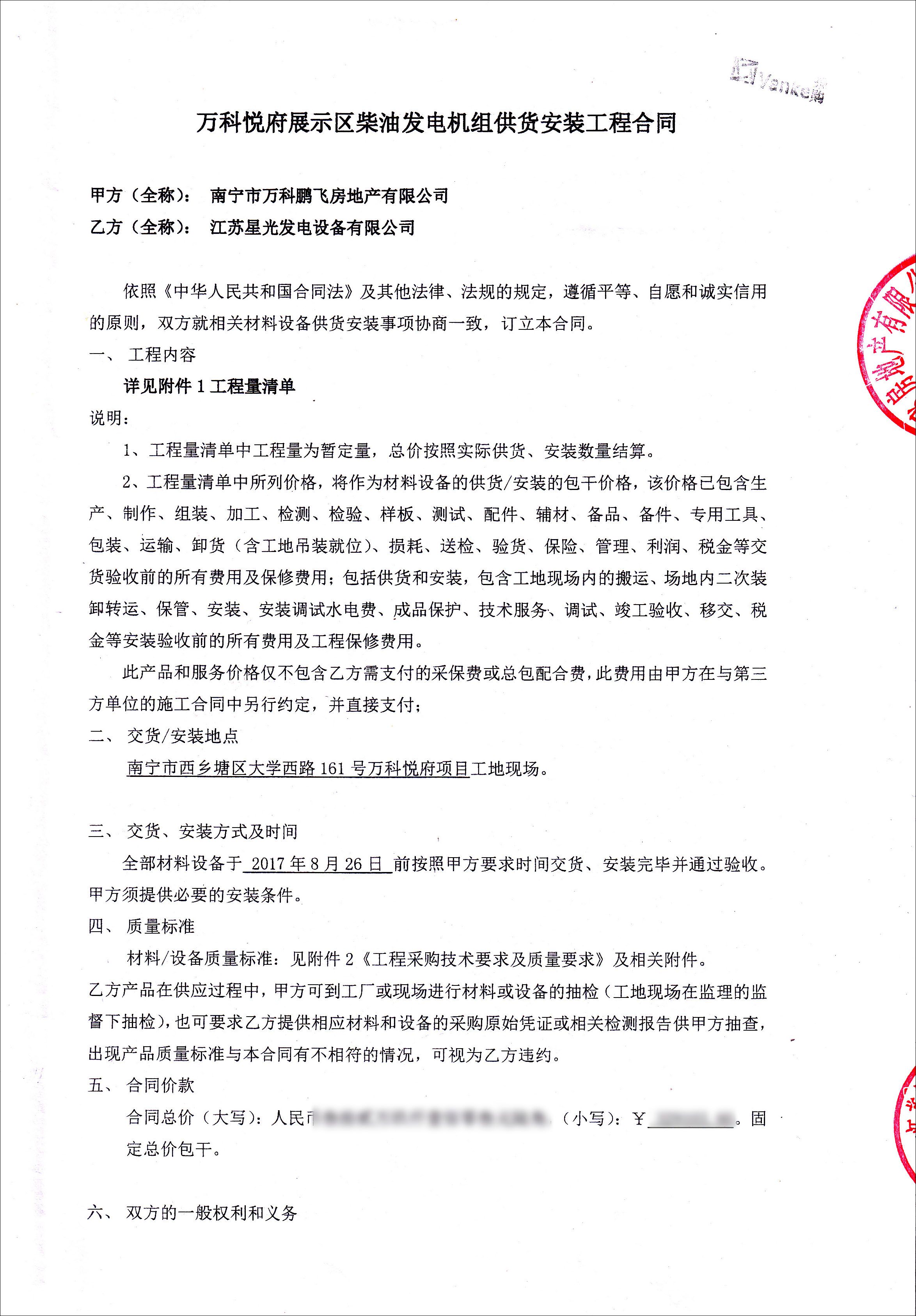 我公司與南寧萬科鵬飛公司簽訂萬科悅府展示區(qū)柴油發(fā)電機組供貨安裝合同