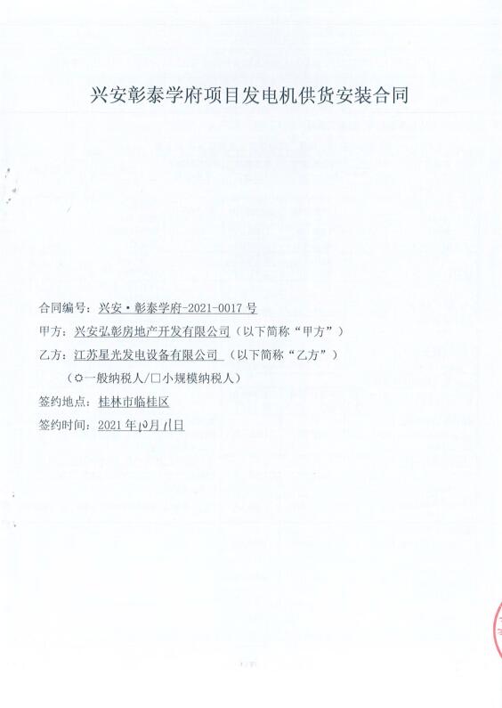 江蘇星光動(dòng)力集團(tuán) >> 新聞動(dòng)態(tài) >> 恭喜我司與興安弘彰房地產(chǎn)開發(fā)有限公司簽訂600KW無動(dòng)柴油發(fā)電機(jī)組
