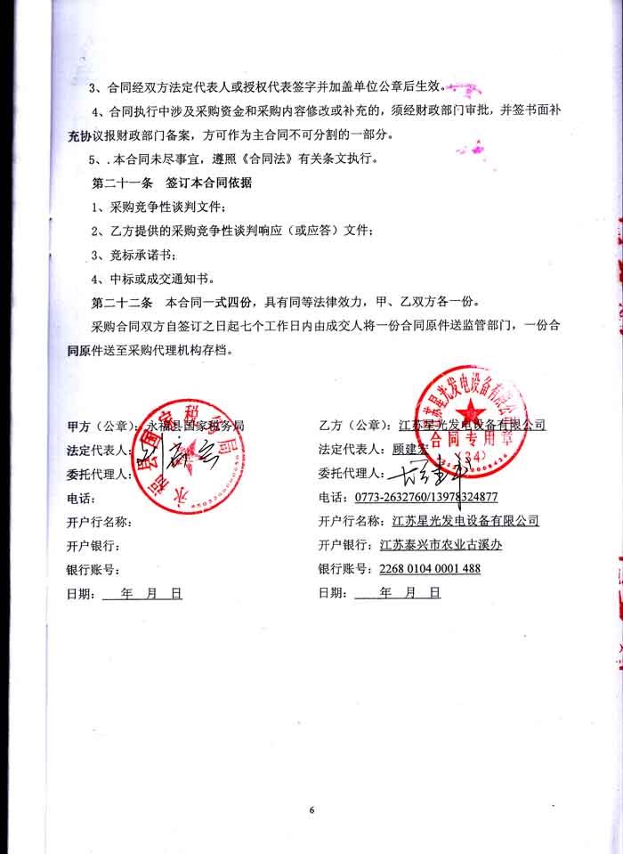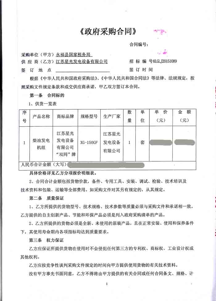 2015年12月28日,廣西永??h國家稅務(wù)局與我公司簽訂了150KW發(fā)電機(jī)組購銷合同,我公司為其提供里卡多柴油發(fā)電機(jī)配星光發(fā)電機(jī)的柴油發(fā)電機(jī)組一臺(tái)。江蘇星光動(dòng)力集團(tuán)自成立以來就以技術(shù)創(chuàng)新為己任,設(shè)計(jì)生產(chǎn)的柴油發(fā)電機(jī)組一直在同行業(yè)中遙遙領(lǐng)先,得到各種外界人士的認(rèn)可。發(fā)電機(jī)產(chǎn)品購銷合同如下: