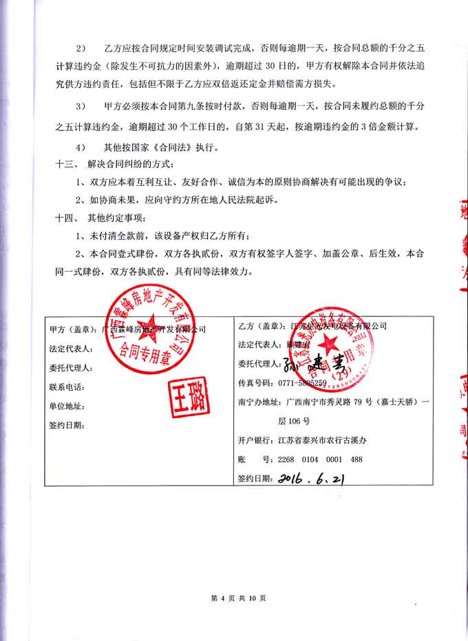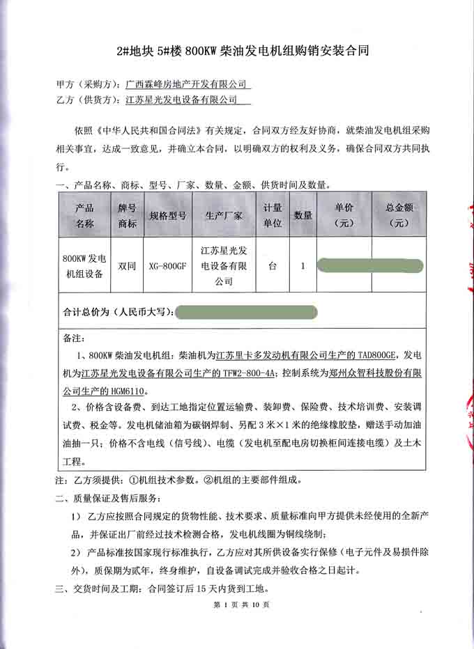 2016年6月21日,我江蘇星光動(dòng)力集團(tuán)成功與廣西霖峰房地產(chǎn)開發(fā)有限公司簽訂2#塊地5#樓800KW柴油發(fā)電機(jī)組購銷安裝合同,我公司為其提供一臺配置為為江蘇里卡多發(fā)動(dòng)機(jī)配星光發(fā)電機(jī)和眾智控制器的發(fā)電機(jī)組,并負(fù)責(zé)機(jī)組的運(yùn)輸安裝和調(diào)試工作及對發(fā)電機(jī)操作人員進(jìn)行培訓(xùn)。發(fā)電機(jī)產(chǎn)品購銷合同如下: