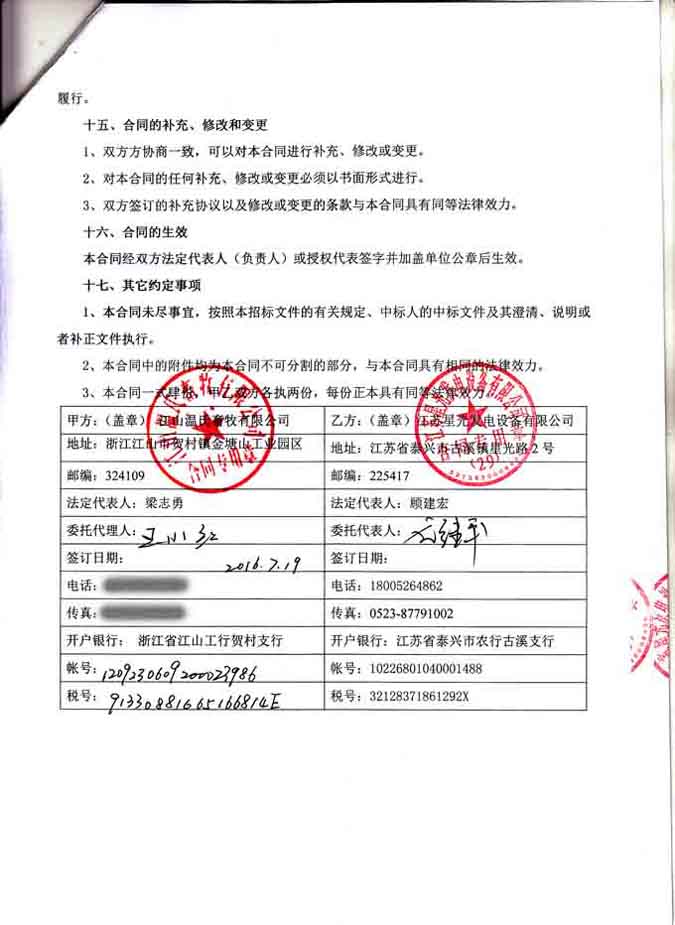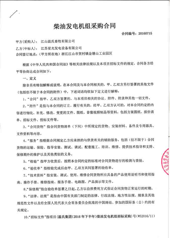 江蘇星光動(dòng)力集團(tuán) >> 新聞動(dòng)態(tài) >> 江山溫氏畜牧有限公司160KW康明斯發(fā)電機(jī)組采購合同