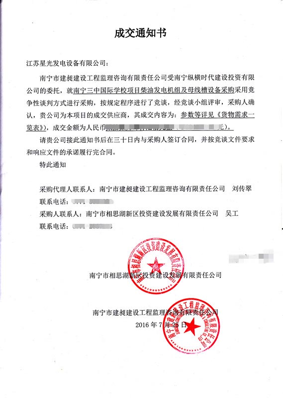 2016年7月25日,南寧市建昶建設(shè)工程監(jiān)理咨詢有限責(zé)任公司受南寧縱橫時(shí)代建設(shè)投資有限公司的委托,就南寧三中國(guó)際學(xué)校項(xiàng)目柴油發(fā)電機(jī)組及母線槽設(shè)備采購(gòu)采用競(jìng)爭(zhēng)談判方式進(jìn)行采購(gòu),按規(guī)定程序進(jìn)行競(jìng)談,經(jīng)競(jìng)談小組評(píng)審,采購(gòu)人確認(rèn),江蘇星光發(fā)電設(shè)備有限公司為本項(xiàng)目的成交供應(yīng)商。以下是采購(gòu)成交通知書(shū):