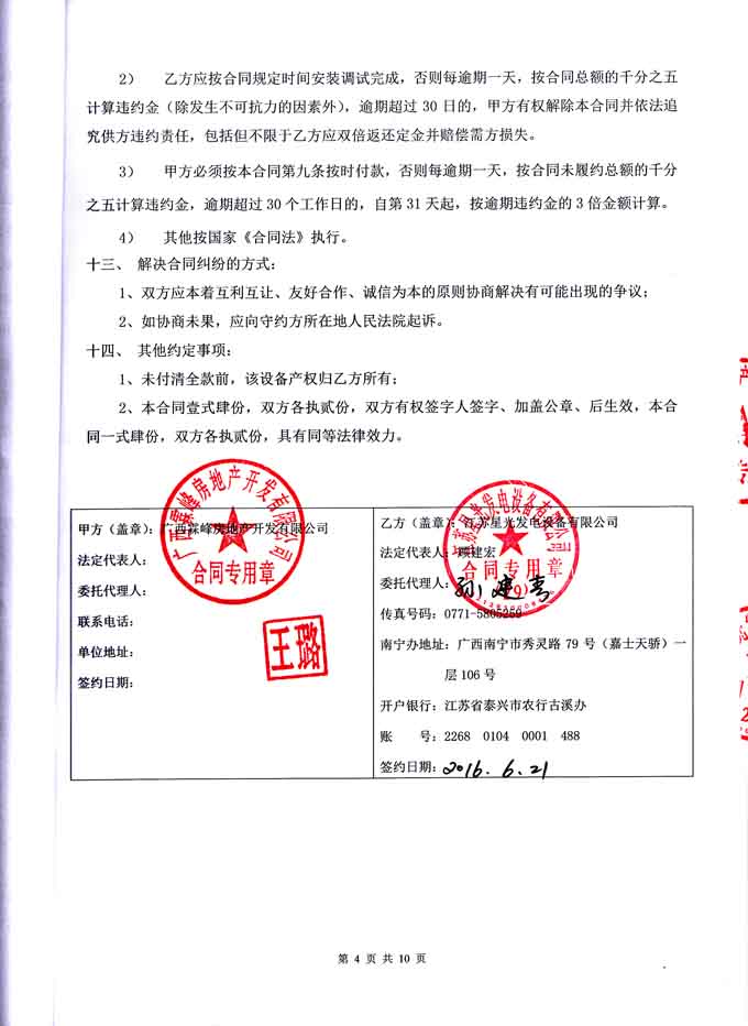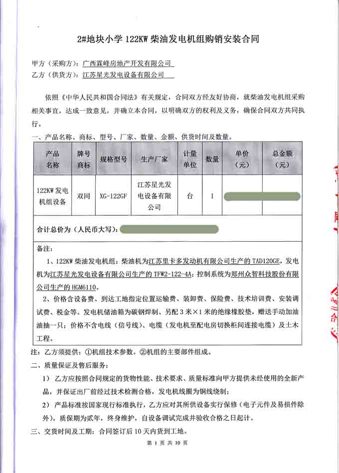 2016年6月21日,廣西霖峰房地產(chǎn)開發(fā)有限公司與我公司簽訂2#塊地小學(xué) 122KW柴油發(fā)電機(jī)組購(gòu)銷安裝合同,我公司為其提供一臺(tái)里卡多柴油發(fā)電機(jī)組一臺(tái),機(jī)組配置為江蘇里卡多發(fā)動(dòng)機(jī)配星光發(fā)電機(jī)及鄭州眾智控制器。發(fā)電機(jī)產(chǎn)品購(gòu)銷合同如下: