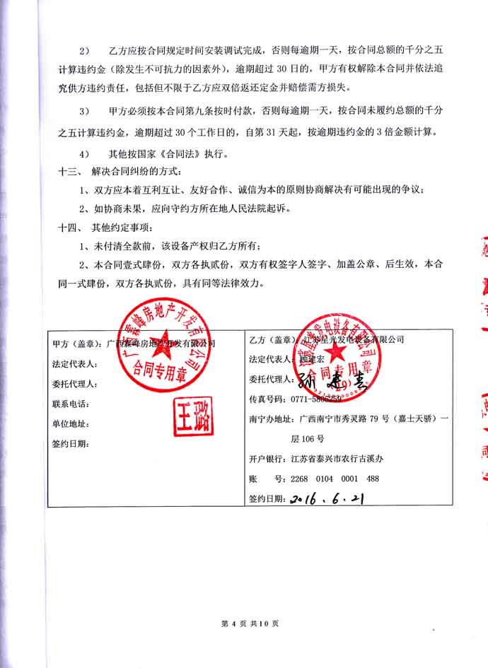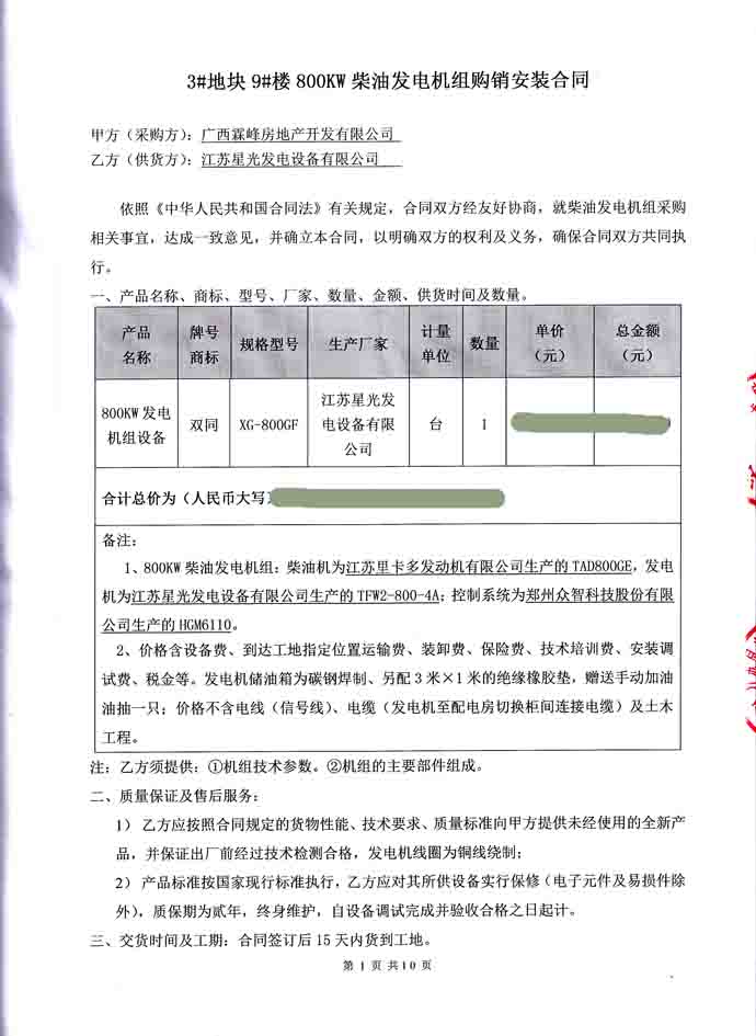 2016年6月21日,廣西霖峰房地產(chǎn)開發(fā)有限公司與我公司簽訂3#塊地 9#樓柴油發(fā)電機(jī)組購銷安裝合同,我公司為其提供一臺800KW發(fā)電機(jī)組,機(jī)組配置為江蘇里卡多發(fā)動機(jī)配星光發(fā)電機(jī)。發(fā)電機(jī)產(chǎn)品購銷合同如下: