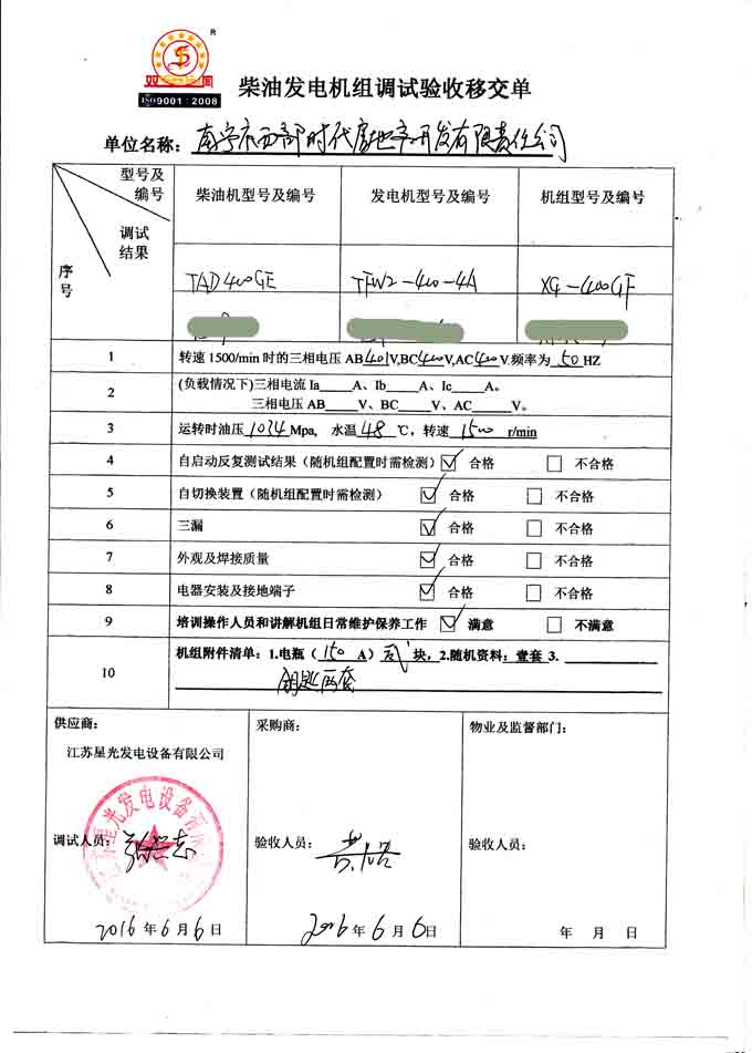 2016年6月6日,我公司技術(shù)服務(wù)人員到南寧市西部時代房地產(chǎn)開發(fā)有限責(zé)任公司的發(fā)電機組安裝現(xiàn)場進行調(diào)試交付工作,我公司為其提供的一臺400KW沃爾沃發(fā)電機組并負責(zé)機組的安裝調(diào)試,調(diào)試好后為其培訓(xùn)操作人員和講解機組日常維護保養(yǎng)工作。以下是發(fā)電機組調(diào)試驗收單: