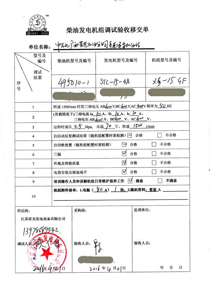 2016年4月21日,在中石化廣西貴港石油分公司平南平安加油站的發(fā)電機(jī)組安裝現(xiàn)場(chǎng),就平南加油站與我公司夠買的15KW濰柴發(fā)電機(jī)組進(jìn)行調(diào)試驗(yàn)收移交工作,此刻機(jī)制已經(jīng)做好安裝調(diào)試工作,操作人員的培訓(xùn)和講解機(jī)組日常維護(hù)保養(yǎng)注意事項(xiàng),以下是發(fā)電機(jī)組調(diào)試驗(yàn)收單: