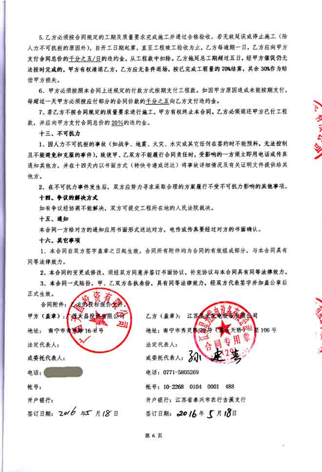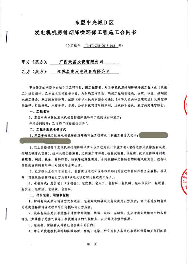 2016年5月18日,我公司就廣西天昌投資有限公司購買的400KW康明斯發(fā)電機(jī)簽訂東盟中央城D區(qū)發(fā)電機(jī)機(jī)房排煙降噪環(huán)保工程施工合同,我公司為其提供柴油發(fā)電機(jī)組的機(jī)房噪聲、廢氣綜合治理、環(huán)保工程及機(jī)房照明、排風(fēng)工程的設(shè)計及施工。合同如下: