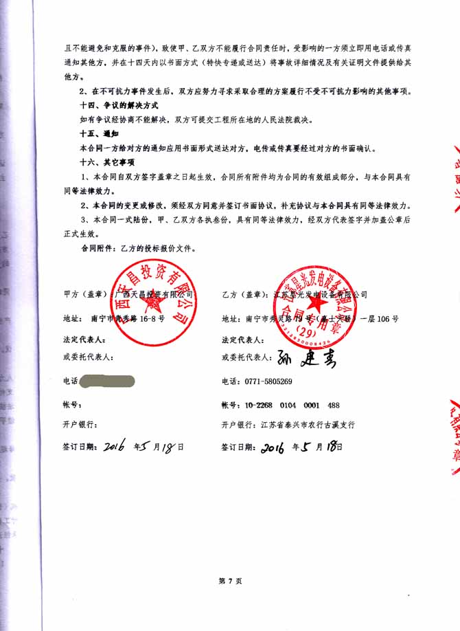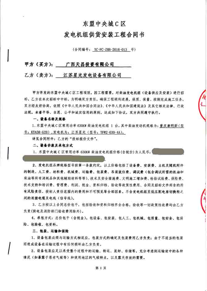 2016年5月18日,我公司憑借精湛的發(fā)電機(jī)技術(shù),優(yōu)良的品質(zhì)和完善的售后服成功與廣西天昌投資有限公司簽訂?wèn)|盟中央城C區(qū)發(fā)電機(jī)組供貨安裝工程合同,我公司為其提供 常用功率630KW柴油發(fā)電機(jī)一臺(tái),其中柴油發(fā)動(dòng)機(jī)規(guī)格為:重慶康明斯(型號(hào):KTA38-G2B),發(fā)電機(jī)為:江蘇星光(型號(hào)TFW2-630-4A)。發(fā)電機(jī)產(chǎn)品購(gòu)銷合同如下: