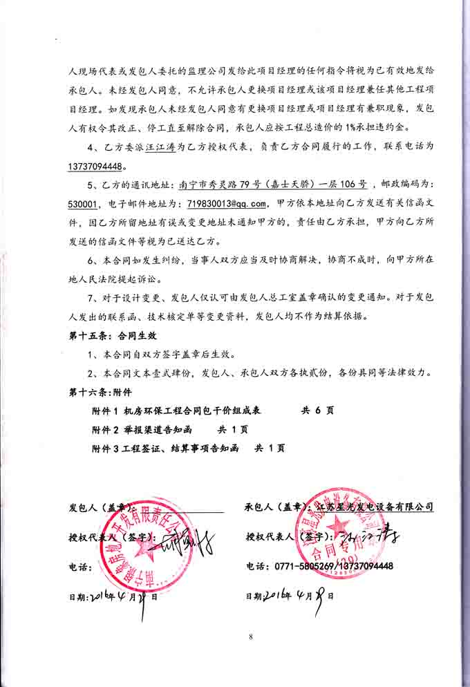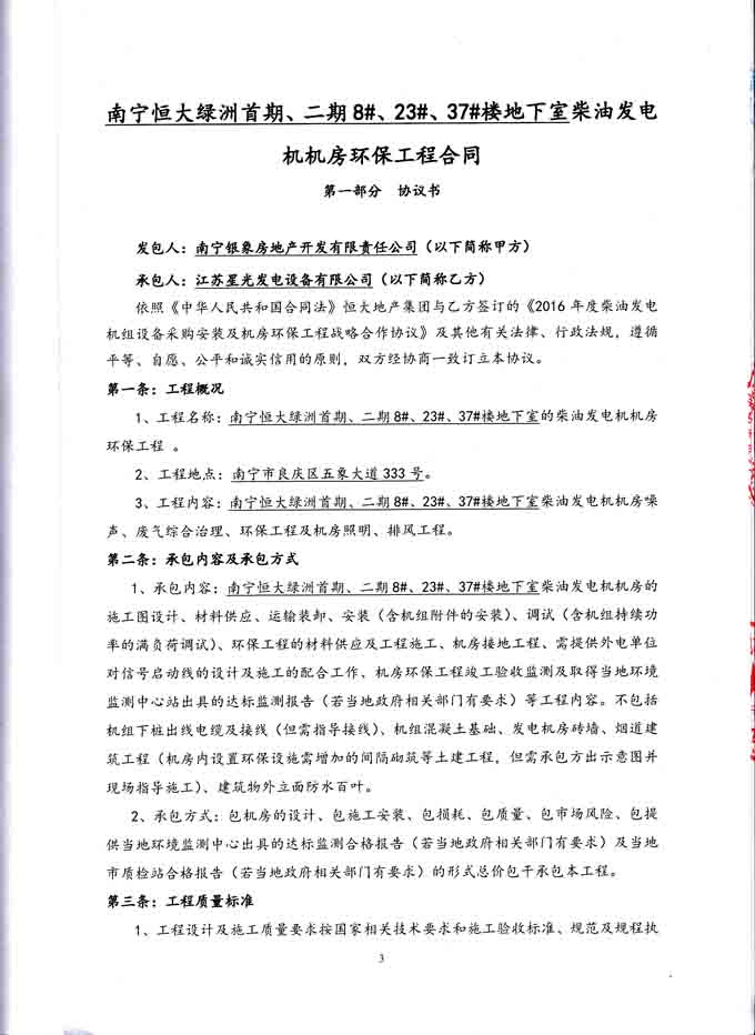 2016年4月29日,我公司與南寧銀象房地產(chǎn)開發(fā)有限責(zé)任公司簽訂南寧恒大綠洲首期、二期8#、23#、37#地下室柴油發(fā)電機機房環(huán)保工程合同,我公司分別為其提供400KW發(fā)電機組、640KW柴油發(fā)電機組和800KW柴油發(fā)電機組的機房噪聲、廢氣綜合治理、環(huán)保工程及機房照明、排風(fēng)工程。合同如下: