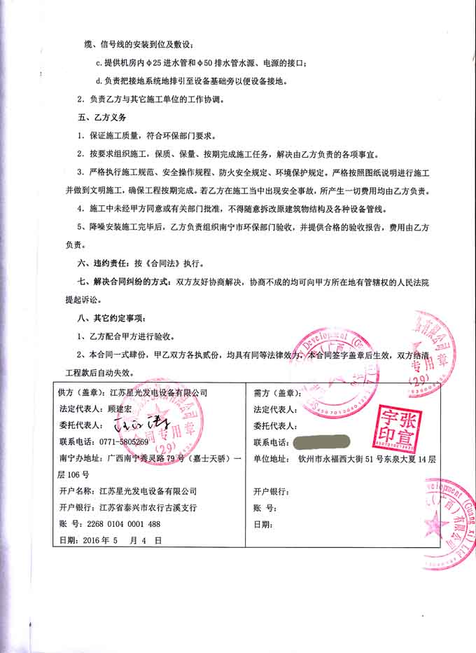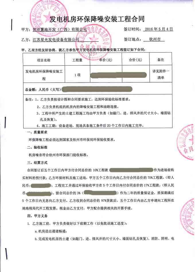 2016年5月4日,世洋置地開發(fā)(廣西)有限公司工程與我公司簽訂800KW柴油發(fā)電機組機房環(huán)保降噪安裝工程合同,我公司負責發(fā)電機組在的降噪工程安裝及油路連接,并保證環(huán)保降噪工程達到環(huán)保局的驗收要求,合同如下: