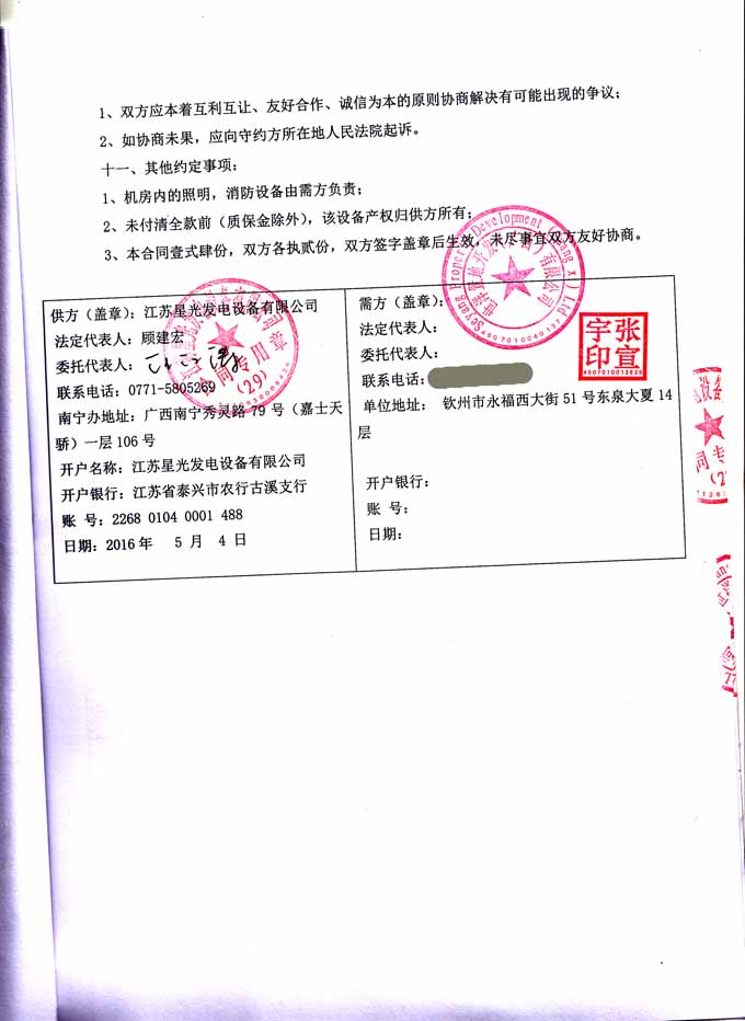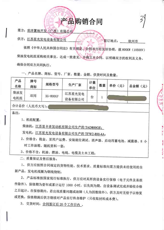 2016年5月4日,我公司成功與世洋置地開發(fā)(廣西)有限公司簽訂800KW柴油發(fā)電機組產(chǎn)品購銷合同,我公司為其提供配置為柴油機:江蘇里卡多發(fā)動機生產(chǎn)的TAD800GE;發(fā)電機:江蘇星光發(fā)電設備有限公司機生產(chǎn)的TFW2-800-4A的里卡多柴油發(fā)電機組一臺。發(fā)電機產(chǎn)品購銷合同如下: