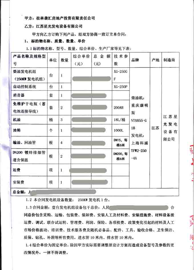 桂林襲匯房地產(chǎn)投資公司250KW康明斯發(fā)電機(jī)組采購(gòu)安裝合同