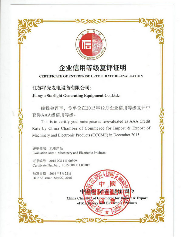 2016年3月22日,我公司收到中國(guó)機(jī)電產(chǎn)品進(jìn)出口商會(huì)的《企業(yè)信用等級(jí)復(fù)評(píng)證明》,證書表明經(jīng)中國(guó)機(jī)電產(chǎn)品進(jìn)出口商會(huì)評(píng)審,江蘇星光發(fā)電設(shè)備有限公司在2015年12月企業(yè)信用等級(jí)復(fù)評(píng)中獲得AAA級(jí)信用等級(jí)。