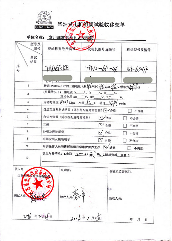 2016年2月25日,我江蘇星光集團發(fā)電機技術人員到富川瑤族自治縣人民醫(yī)院的柴油發(fā)電機組安裝現場,對我公司提供的630KW發(fā)電機組(機組配置:柴油機為里卡多發(fā)動機,發(fā)電機為星光發(fā)電機)進行調試交付工作,并為其培訓操作人員和講解機組日常維護保養(yǎng)工作。以下是發(fā)電機組調試驗收單: