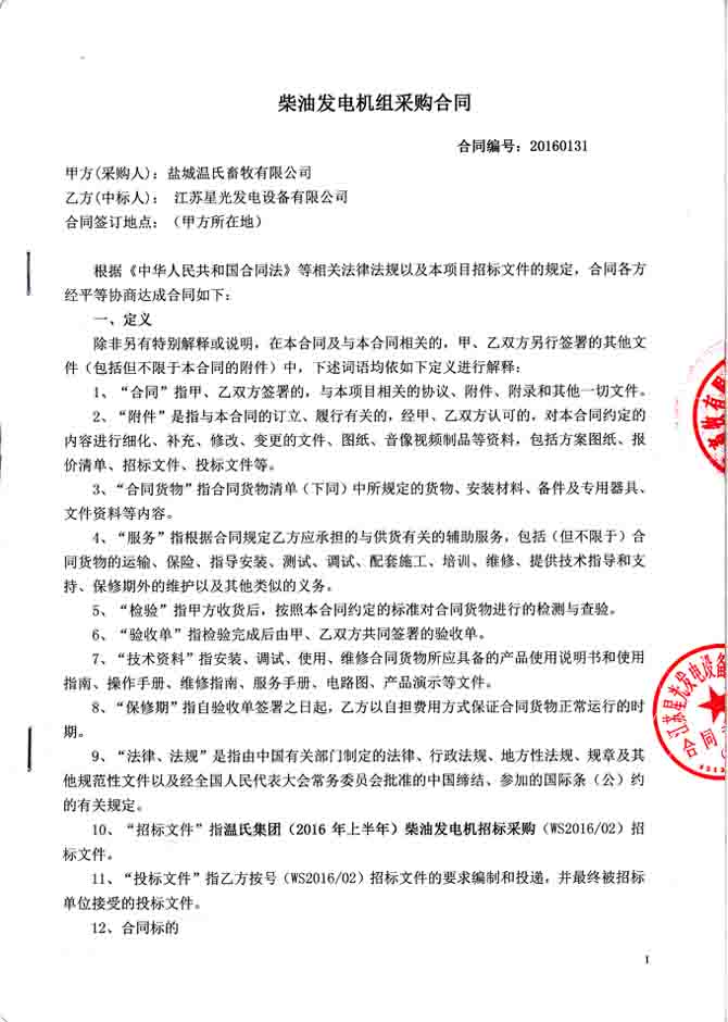 2016年1月31日,鹽城溫氏畜牧有限公司與我公司簽訂發(fā)電機(jī)組采購合同,我公司為其提供重慶康明斯柴油機(jī)配無錫斯坦福發(fā)電機(jī)及英國深??刂破鞯?strong>500KW柴油發(fā)電機(jī)組一臺,并負(fù)責(zé)機(jī)組的運(yùn)輸安裝調(diào)試及發(fā)電機(jī)技術(shù)人員的培訓(xùn)。發(fā)電機(jī)產(chǎn)品購銷合同如下: