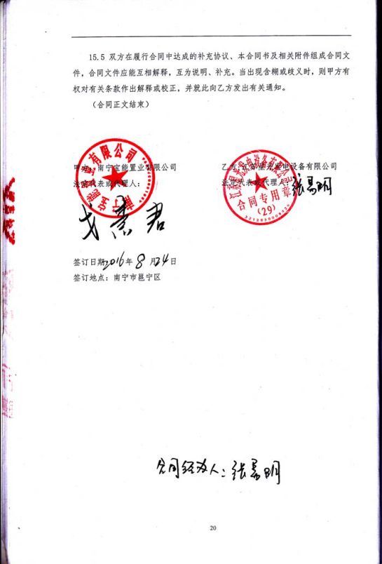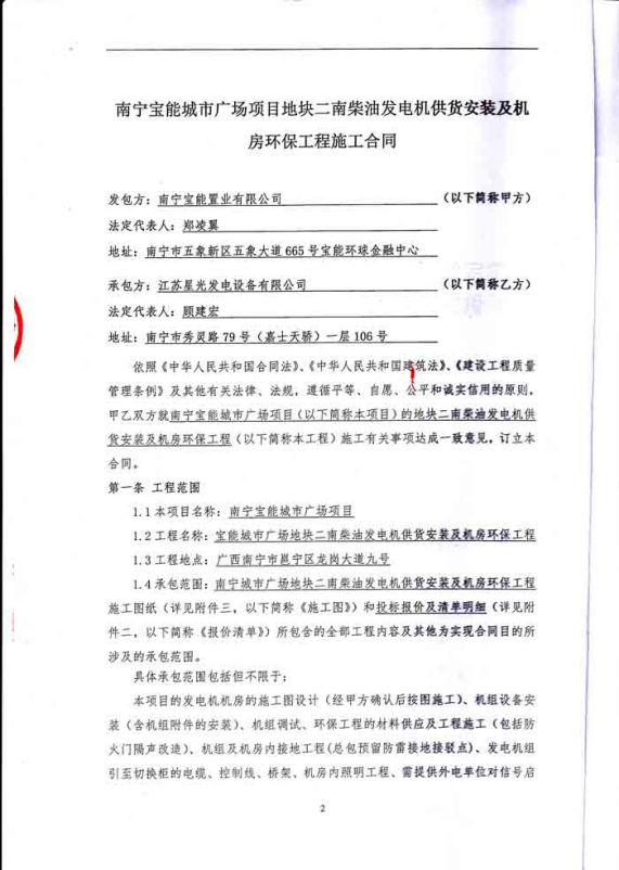 2016年8月24日,我公司成功與南寧寶能置業(yè)有限公司簽訂南寧寶能城市廣場項目地塊二南柴油發(fā)電機供貨安裝及機房環(huán)保工程施工合同。合同如下: