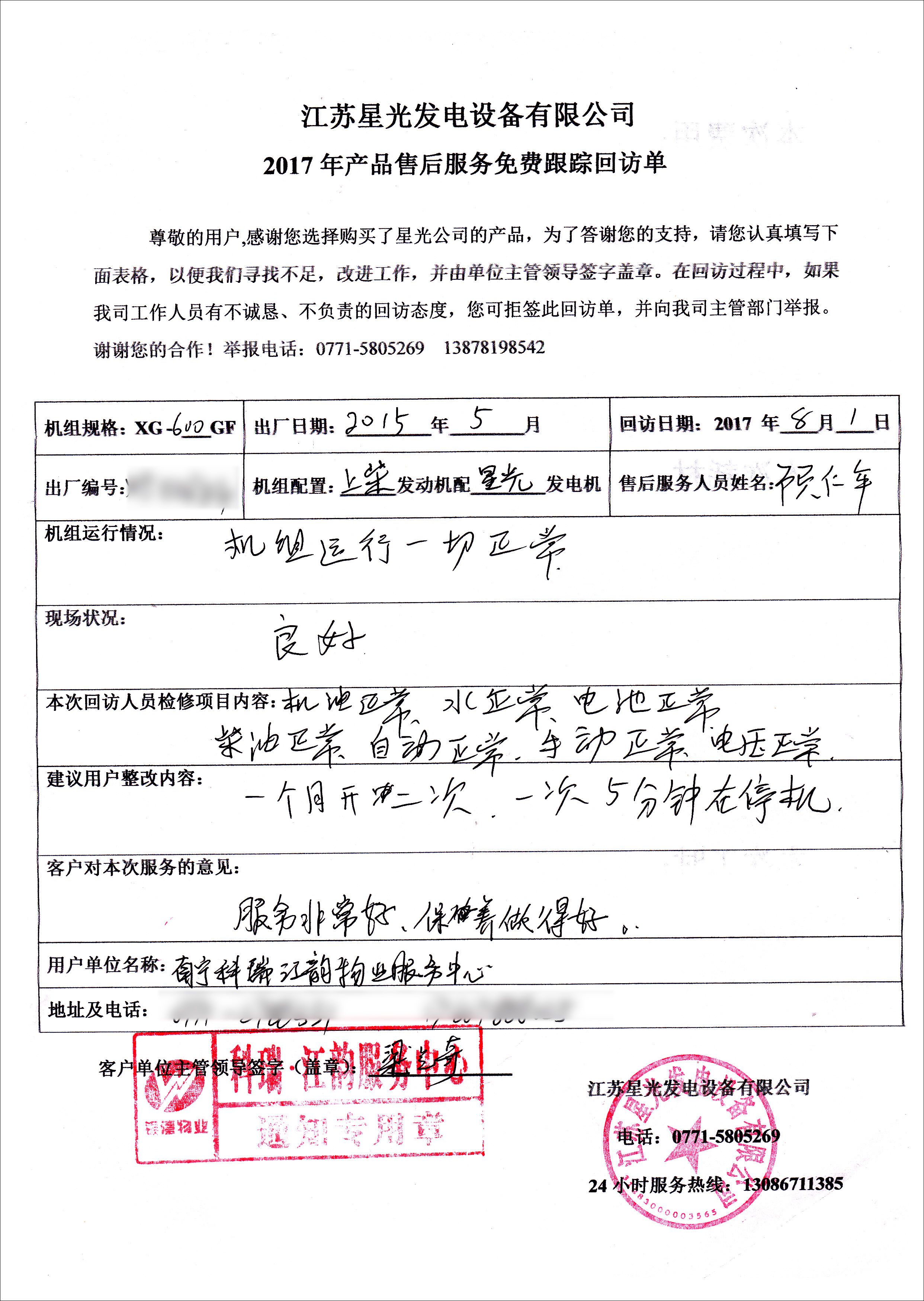 銀灣物業(yè)于2015年5月在我公司購買了一臺600KW上柴發(fā)電機(jī)組,配置為上柴發(fā)動機(jī)配星光發(fā)電機(jī)。8月1日,我公司售后技術(shù)員顧師傅到科瑞·江韻對這臺發(fā)電機(jī)組進(jìn)行免費(fèi)售后服務(wù)。經(jīng)檢查,機(jī)油、水、電池、發(fā)電電壓均正常,機(jī)組自動化、手動均正常。為保證長期不使用的??機(jī)組機(jī)能保持良好的工作狀態(tài),顧師傅建議一個月開機(jī)兩次,每次運(yùn)行5分鐘后停機(jī)。更多關(guān)于上柴發(fā)電機(jī)組售后服務(wù)歡迎撥打星光熱線:13878198542