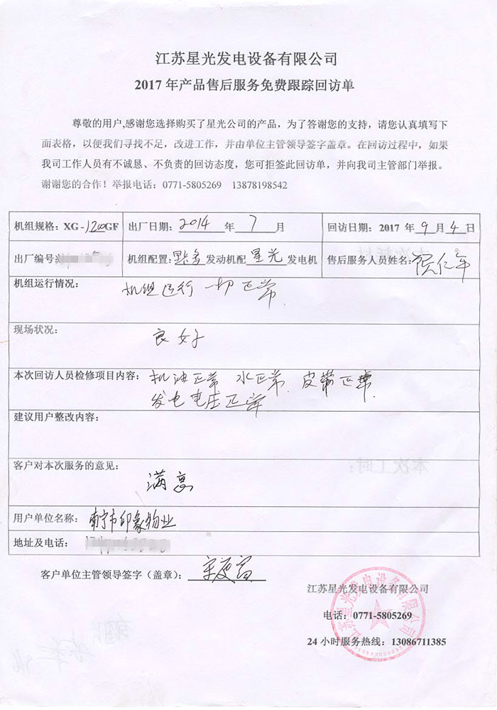 江蘇星光動力集團 >> 服務(wù)跟蹤 >> 南寧市印象物業(yè)1200KW里卡多發(fā)電機組免費跟蹤回訪