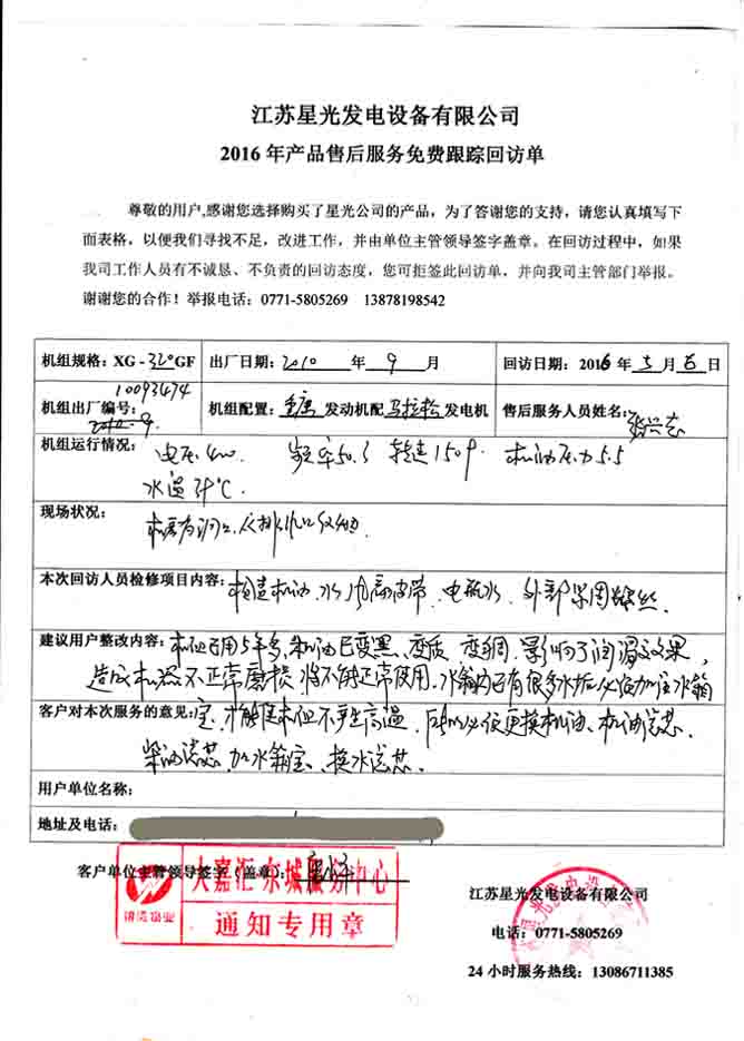 2016年5月6日,我公司技術(shù)人員到大嘉匯東城服務(wù)中心進(jìn)行發(fā)電機(jī)組免費(fèi)回訪。本次回訪的機(jī)組是2010年我公司為其提供的重慶康明斯柴油機(jī)配馬拉松發(fā)電機(jī)的320KW發(fā)電機(jī)組。技術(shù)人員啟動(dòng)機(jī)組檢查機(jī)油、水箱水、風(fēng)葉皮帶、電瓶水、外部堅(jiān)固螺絲等部件,并針對(duì)機(jī)組目前的運(yùn)行狀況給出建議。下面是本次回訪記錄: