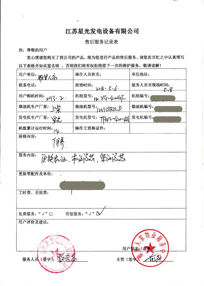2016年5月8日,我江蘇星光發(fā)電設(shè)備有限公司售后服務(wù)人員應(yīng)雅里人家物業(yè)服務(wù)中心來電要求到場對發(fā)電機組進(jìn)行保養(yǎng),此次保養(yǎng)的機組為2013年我公司為其提供的400KW柴油發(fā)電機組(配置:上柴柴油機配星光發(fā)電機),經(jīng)過 檢查,技術(shù)人員為機組更換了機油、機油濾芯及柴油濾芯等部件。以下是售后服務(wù)記錄表: