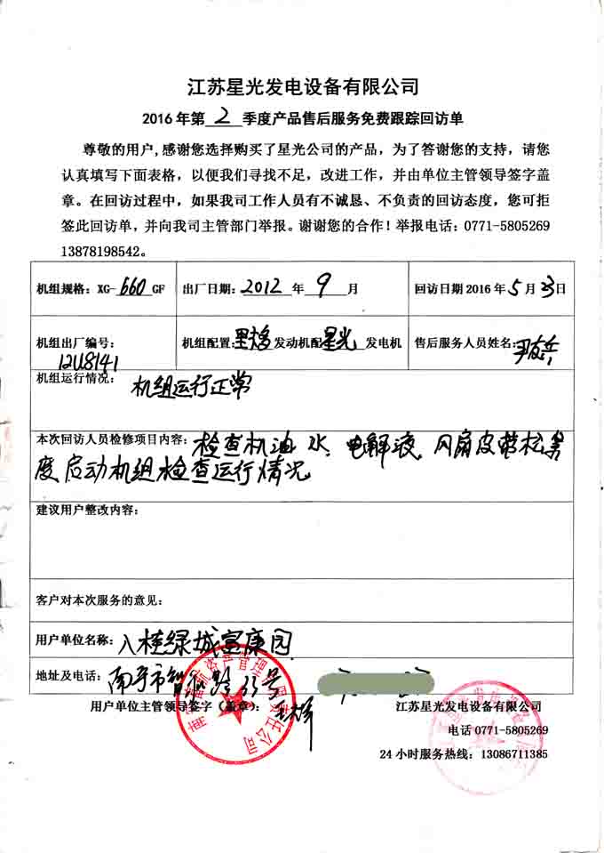 2016年5月23日,我星光動力集團售后人員到八桂綠城富康園)對我公司為南寧富航資產(chǎn)管理有限責(zé)任公司提供的660KW柴油發(fā)電機組(配置為里卡多發(fā)動機配星光發(fā)電機)進行免費回訪。售后人員本次回訪主要的啟動機組檢測機組的運行情況,檢查機組的機油、水箱水、電解液,風(fēng)扇皮帶松緊度等。下面是本次回訪記錄: