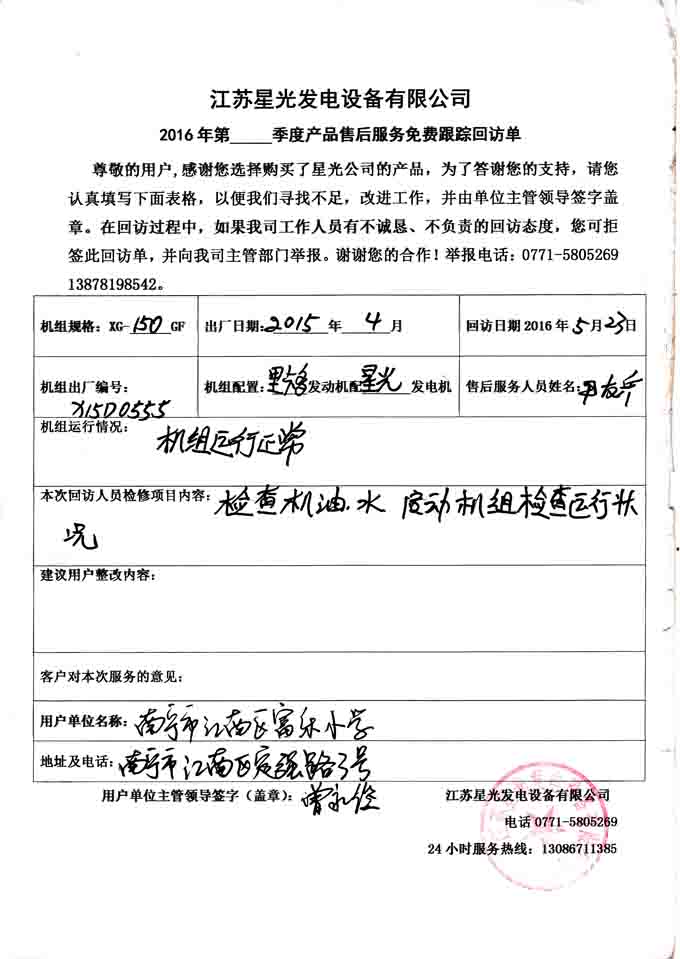 江蘇星光動(dòng)力集團(tuán) >> 服務(wù)跟蹤 >> 南寧市富樂小學(xué)150KW里卡多發(fā)電機(jī)組免費(fèi)回訪記錄