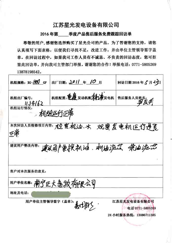 江蘇星光動力集團(tuán) >> 服務(wù)跟蹤 >> 南寧正大畜牧有限公司800KW康明斯發(fā)電機(jī)組免費回訪記錄