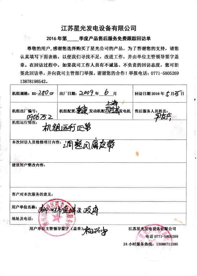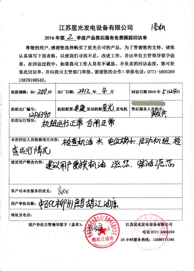 2016年5月24日,我星光動力售后服務(wù)人員到中石化柳州鷓鴣江油庫,對其向我公司購買的兩臺200KW柴油發(fā)電機組(機組配置為東風(fēng)康明斯柴油機配星光發(fā)電機)進行免費回訪。本次回訪主要檢查機組的機油、水箱水、電位端子等部件,并啟動機組檢查機組運行狀況,其中一臺運行正常,一臺正常啟動后升不了高速,電壓達不到并機要求,技術(shù)人員及時處理,最后建議用戶及時更換損壞部件,做好機組保養(yǎng),以保障機組的正常運行及延長使用壽命。下面是本次回訪記錄: