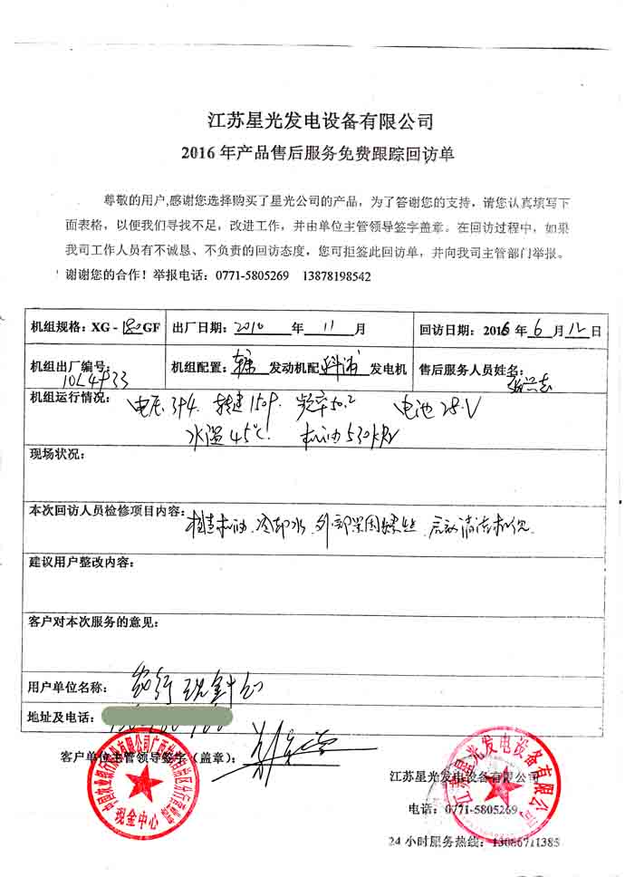 江蘇星光動(dòng)力集團(tuán) >> 服務(wù)跟蹤 >> 農(nóng)業(yè)銀行現(xiàn)金中心180KW東風(fēng)康明斯發(fā)電機(jī)組免費(fèi)回訪記錄