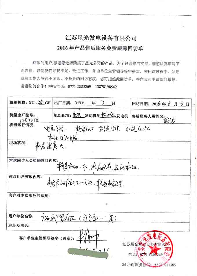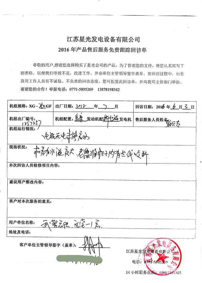 2016年6月3日,我星光動力集團(tuán)售后技術(shù)人員到廣西武警總隊(duì),對我公司為其提供的兩臺250KW發(fā)電機(jī)組進(jìn)行免費(fèi)回訪。技術(shù)人員檢查機(jī)組的機(jī)油、水箱水、風(fēng)扇皮帶等附件設(shè)備,啟動機(jī)組,發(fā)現(xiàn)一臺未能啟動,老鼠將柜子內(nèi)的部分線咬斷。最好技術(shù)人員建議用戶做好機(jī)組維護(hù)和發(fā)電機(jī)房的清潔工作,解決機(jī)房濕度大等問題。下面是本次回訪記錄: