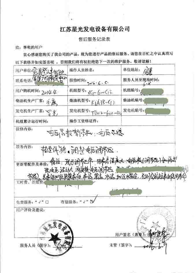 2016年6月8日,我江蘇星光動力集團(tuán)的售后服務(wù)人員到富盛廣場發(fā)電機(jī)房,就廣西容縣登峰物業(yè)管理有限公司向我公司購買的600KW重慶康明斯發(fā)電機(jī)組報修的電壓不穩(wěn),電壓高報警停機(jī)故障進(jìn)行檢修。經(jīng)檢修機(jī)組運行已一切正常。以下是售后服務(wù)記錄表: