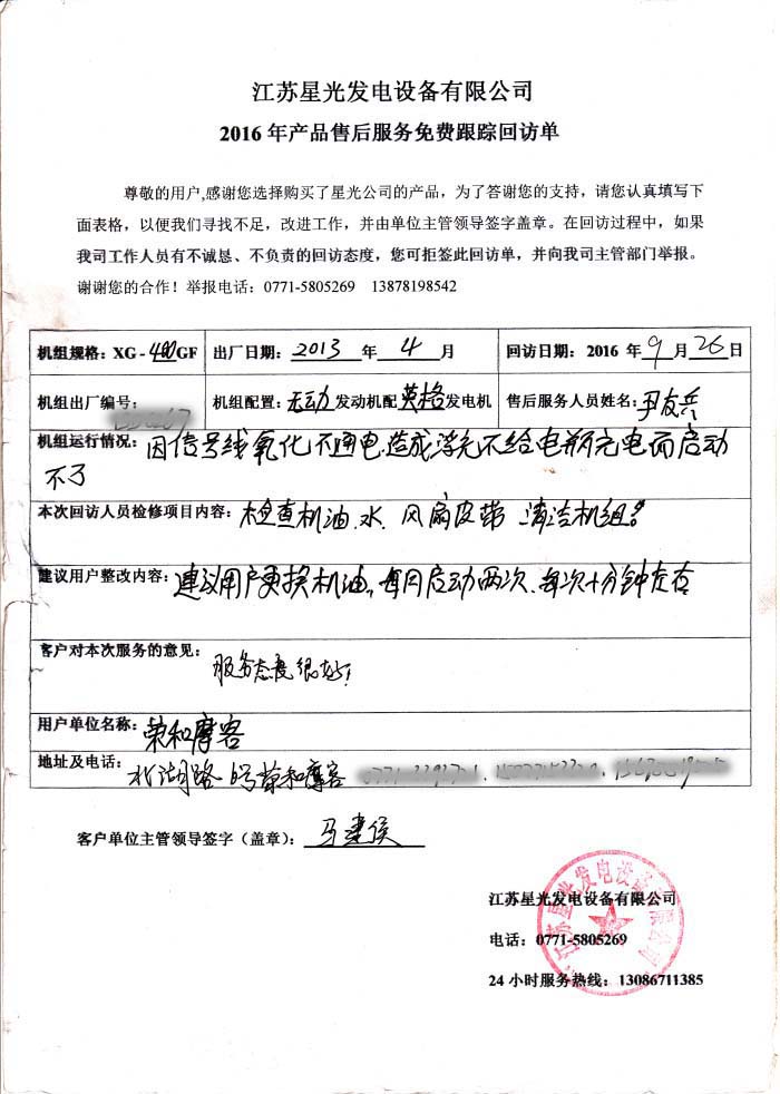 9月26日,我司售后技術(shù)員到南寧北湖路榮和摩客進(jìn)行免費跟蹤回訪。其于2013年4月在我司購買400KW無動柴油發(fā)電機組一臺,配置為無動柴油機配英格發(fā)電機,距今使用時間近4年。我司技術(shù)員通過現(xiàn)場檢查機油、水以及風(fēng)扇皮帶的松緊度及機組運行情況,發(fā)現(xiàn)因信號線氧化導(dǎo)致不通電,進(jìn)而造成浮充無法給電瓶充電而影響正常啟動。技術(shù)員建議用戶更換機油,并每月啟動兩次,每次十分鐘左右。最后我司技術(shù)給機組做徹底地清潔打掃后才安心地結(jié)束本次回訪。用戶對于此舉深受感動,他表示,以后一定會好好照顧機組,盡量避免機組“生病”。