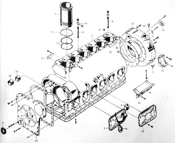 17-冷油器支架;18-鎖簧;19-飛輪殼;20-指針蓋板;21-噴油泵支架;22-定位套筒;23-前蓋板;24-凸輪軸軸承;