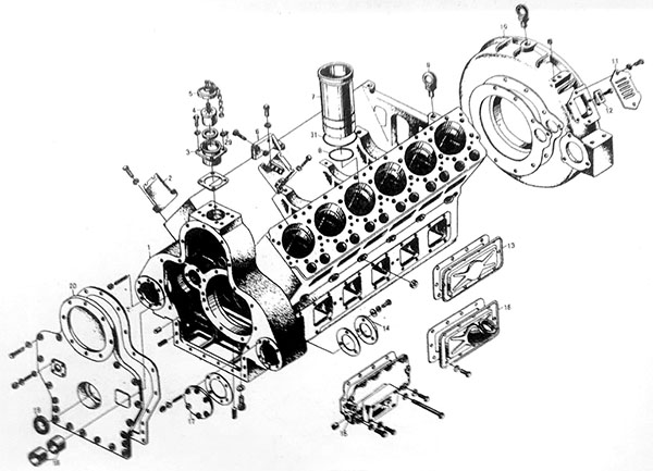 柴油發(fā)電機(jī)組機(jī)體由高強(qiáng)度鑄鐵制成,為隧道式結(jié)構(gòu)。4、6缸直列型柴油發(fā)電機(jī)組機(jī)體,除缸數(shù)不同外,結(jié)構(gòu)相似;12V型柴油發(fā)電機(jī)組機(jī)體兩列氣缸中心線夾角為75度,錯(cuò)缸距為45mm。機(jī)體結(jié)合組零部件如圖1、圖2、圖3所示。
