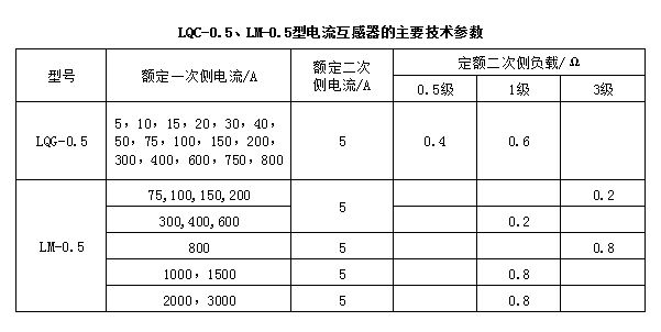 2、電流互感的準確度與其使用容量有關,為此必須使其使用容量小于或等于其額定容量,即電流互感器二次側工作電流應小于或等于額定二次側電流,二次側負載(取三相中最大的一相)應小于或等于額定二次側負載。當計算出的一次側負載大于二次側負載時,可采用兩個型號、變比相同的電流互感器順向串聯(lián)使用,其二次側負載可增加1倍。發(fā)電機組常用LQC-0.5、LM-0.5型電流互感器的主要技術參數(shù)如下表: