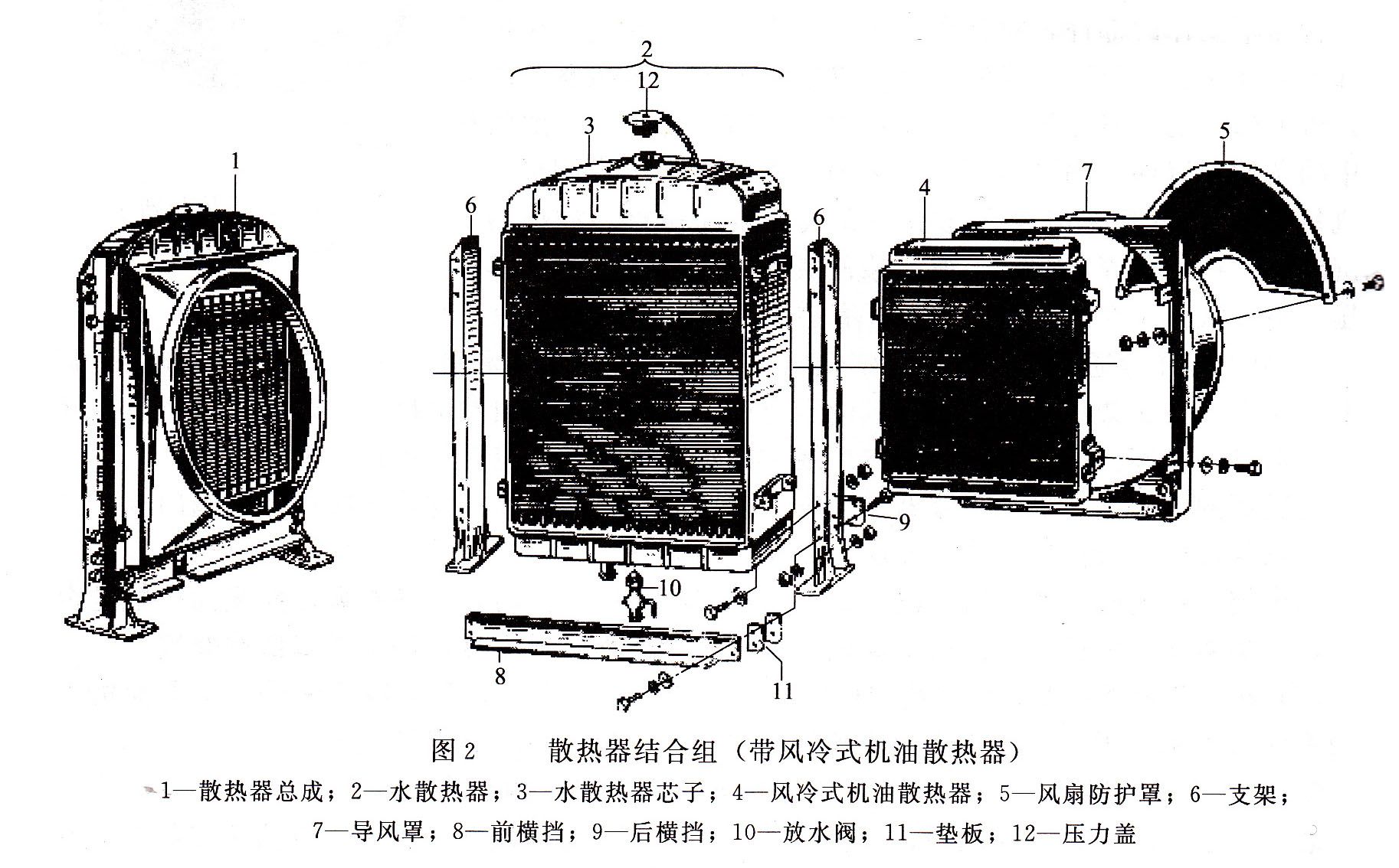 用于4、6直列型柴油機(jī)的風(fēng)冷式機(jī)油散熱器,有兩種規(guī)格,如圖3。12缸V型無(wú)風(fēng)冷式機(jī)油散熱器。