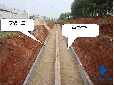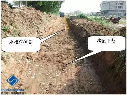 2)電纜壕溝開(kāi)挖后,溝底應(yīng)平整,深淺一致。溝底有一層良好的土層,防止石塊或異物凸起。溝壁要有防止坍塌的措施。
