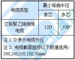 2)電纜路徑的上下左右轉(zhuǎn)向部位,均應(yīng)滿足電纜允許彎曲半徑要求。如下表所示。