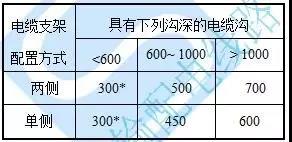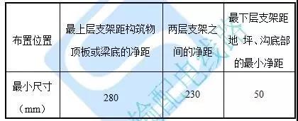 e)水平敷設時電纜支架的最上層、最下層及兩層之間布置尺寸,應不小于下表所列值。