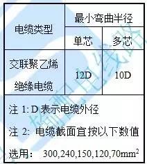 (2)電纜路徑的上下左右轉向部位,均應滿足電纜允許彎曲半徑要求。如下表所示。