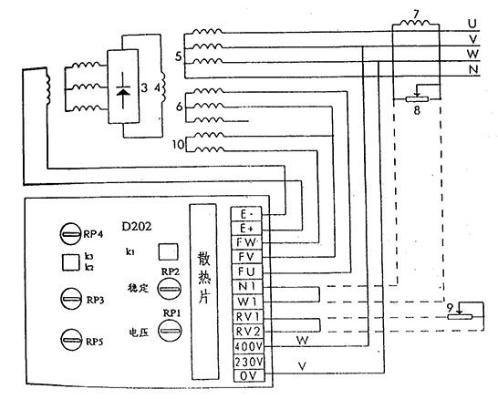 5、發(fā)電機主定子繞組   6、輔助繞組   7、調(diào)差互感器   8、調(diào)差電位器