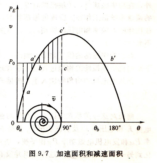 假定在短路被切除以后,某臺發(fā)電機具有圖9.7所示的功角特性,且此時發(fā)電機的功角為θa,并假定此刻發(fā)電機轉子和電網(wǎng)的電壓矢量具有相同的轉速,即相對速度v為零。則在柴油機剩余功率的作用下,發(fā)電機轉子由θa被加速,θ角逐漸增大,在到達b點以前,柴油機轉矩總是大于發(fā)電機轉矩,加速過程一直要延續(xù)到b點為止。當θ=θb時,發(fā)電機輸出功率和柴油機功率相平衡,剩余轉矩為零,相對轉速v不再增加而達最大值。由于此時發(fā)電機轉子的轉速大于電壓矢量的轉速,發(fā)電機轉子將借助慣性越過 b 點,繼續(xù)增大θ角,但是剩余功率改變了符號,發(fā)電機轉子開始減速直到c點,發(fā)電機的相對速度v為零,θ角達最大值,在剩余轉矩的作用下,轉子開始了相反的運動過程。發(fā)電機在加速過程中所獲得的動能可用加速面積a'ab表示,在減速過程中所消耗的能可用減速面積bcc'表示,根據(jù)能量守恒原則,加速面積和減速面積應該相等。很顯然,減速積的最大值為bcb'b,如果加速面積小于這一最大值(圖9.7中所示情況),則發(fā)電機轉子在阻尼因素的作用下,經(jīng)過若干擺動之后,便可穩(wěn)定在6點,說明系統(tǒng)經(jīng)過短路這一擾動后,具有功態(tài)穩(wěn)定性;如果加速面積大于bcb'b,則發(fā)電機轉子的運動將越過6'點,柴油機的剩余轉矩再次改變符號,使發(fā)電機轉子進一步加速,直至失去同步,因此系統(tǒng)不具備動態(tài)穩(wěn)定性。