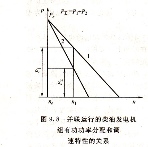 并聯(lián)運(yùn)行的柴油發(fā)電機(jī)組的有功功率分配取決于各機(jī)組的柴油機(jī)調(diào)速特性(圖9.8)。