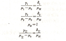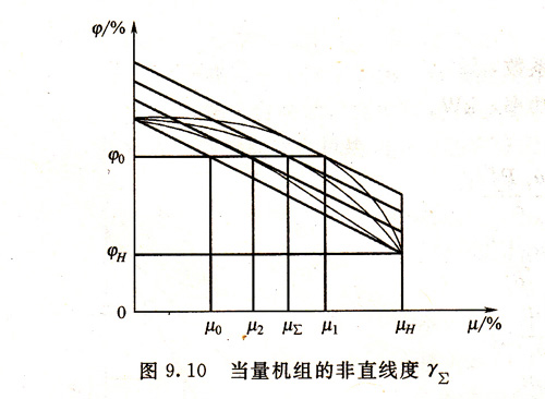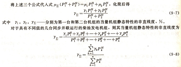 兩臺并聯(lián)運行的柴油發(fā)電機組的靜態(tài)調(diào)速假定相等,不靈敏度也相等并為零。即δ1=δ2,ε1=ε2 =0。非直線度及標(biāo)定功率分別為γ1、γ2托和pH 1、pH 2,則當(dāng)量機組的靜態(tài)調(diào)速特性的非直線度γ∑計算如下。