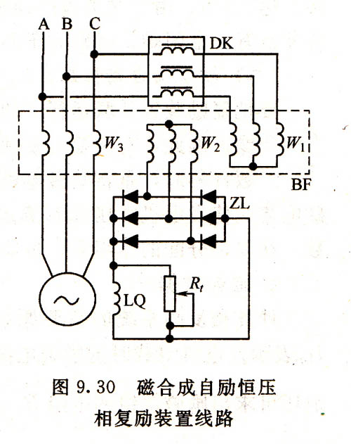 圖9.30是磁合成的自勵(lì)恒壓線路圖,圖中DK為三相線性電抗器,又稱移相電抗器;BF為三相三繞組變壓器,W1BF的電壓繞組,W2為輸出繞組,W3為其電流繞組;ZL為三相橋式整流器,忌為調(diào)整變阻器,LQ發(fā)電機(jī)的勵(lì)磁繞組。