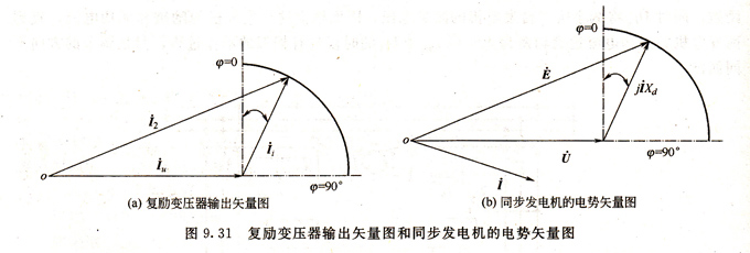 可見,發(fā)電機(jī)的勵(lì)磁電流由兩部分疊加而成:一部分為Iu= K12I1,它基本上是由發(fā)電機(jī)端電壓經(jīng)移相電抗器提供的,叫做勵(lì)磁電流的自勵(lì)分量或電壓分量;一部分為Ii= K32I3,是由發(fā)電機(jī)負(fù)載電流提供的,叫做勵(lì)磁的電流分量或復(fù)勵(lì)分量。由于Iu流過感抗很大的移相電抗器,因此在相位上對發(fā)電機(jī)端電壓約滯后90°,而Ii則和發(fā)電機(jī)負(fù)載電流同相位。注意到這兩點(diǎn),就容易畫出I2的矢量圖,如圖9. 31(a)所示。圖9.31(a)還表明了當(dāng)功率因數(shù)角φ變化時(shí),勵(lì)磁電流I2的變化規(guī)律。