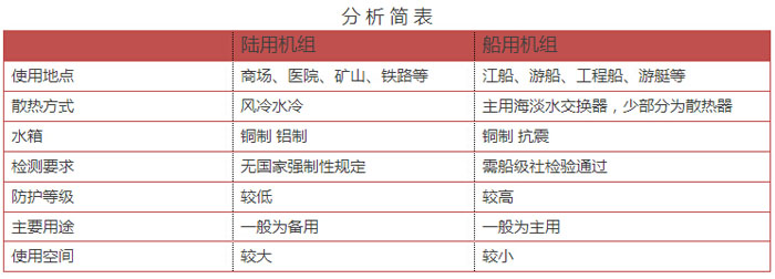 此外,船用機組分主機和輔機,大多數(shù)情況要求多機并聯(lián),陸用機組視具體情況相對簡單,兩者使用條件也不一樣,船用發(fā)電機組是在內(nèi)陸河流或海洋上運行使用,因此防水、防潮、防鹽堿、抗沖擊、抗顛簸的能力有強制要求。